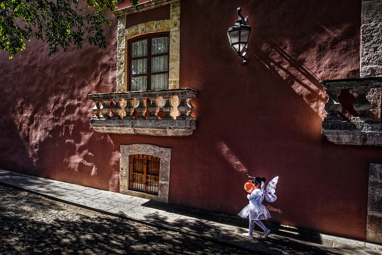 A young girl in a butterfly costume walks along a sidewalk after participating in the Spring Parade in colonial Morelia, Michoacan, Mexico.